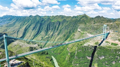 花江峡谷大桥全长2890米,桥面距水面625米,高度居世界第一,主桥跨径1420米居山区桥梁跨径世界第一,即将于9月下旬投入使用。