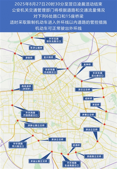 一、自2025年8月27日20时30分至翌日凌晨活动结束,公安机关交通管理部门将根据道路和交通流量情况,对外环东路与昆仑路交口、外环南路与友谊南路交口、外环西路与秀川路交口、外环西路与芥园西道交口、外环北路与铁东北路交口、外环东路与志成路交口等6处路口,金钟桥、津汉立交桥、成林桥、津滨桥、津塘立交桥、津沽立交桥、洞庭路立交桥、津港桥、津淄公路立交桥、津涞立交桥、津静公路立交桥、西青道桥(津同桥)、津保桥、京津公路桥、宜兴埠桥等15座桥梁,适时采取限制机动车进入外环线以内道路的管控措施。机动车可正常驶出外环线。