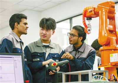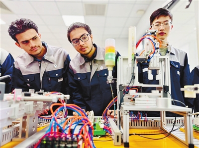 暑假期间,天津现代职业学院巴基斯坦鲁班工坊学历教育留学生,观摩2025年世界职业院校技能大赛总决赛争夺赛“智能装备应用赛道”高职组备赛,与选手交流,感受大赛氛围。 记者 刘欣 摄