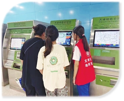 每逢周五下午客流高峰,在地铁4号线和平路站窗口站点,海河中学高一年级的师生志愿者们便准时上岗。他们积极响应“百万师生文明接力”号召,利用暑期参与地铁共建项目。在自动售票机前,同学们耐心指导外地游客和老人购票;在服务台,热情解答换乘咨询……同学们以饱满的热情、专业的服务,传递着天津的开放包容与青春活力。
