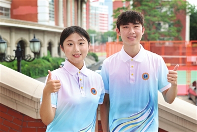 上合峰会外语翻译志愿者、天津外国语大学学生刘玮琳(左)、禤文烨:“我们会精准传递每段文字,为峰会搭好桥梁,欢迎齐聚上合!”