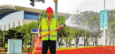 西青区津门湖街绿化养护工人杨中威:“作为一名绿化养护工人,我会用心守护城市的美丽,衷心祝愿本次大会圆满成功!”