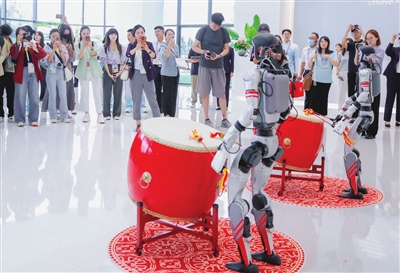 活动伊始,位于未来中心一层的智能机器人以铿锵鼓声热情迎宾,传统与现代的巧妙融合瞬间点燃现场气氛,记者们纷纷驻足拍摄。