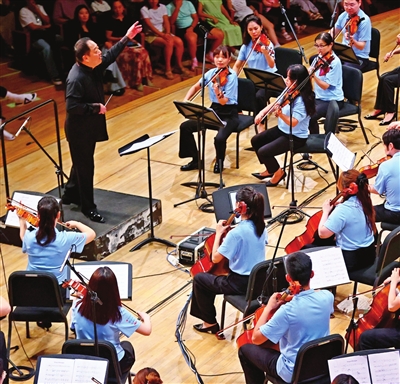 本场演出由参加培训的36名学员携手天津音乐学院联合乐团共同演绎,并特邀著名指挥家吕嘉执棒。音乐会以鲍元恺《炎黄风情》中的乐曲开篇,展现中国民族音乐的魅力。《太阳出来喜洋洋》《紫竹调》《小白菜》《放马山歌》等作品用西方管弦乐技法勾勒出东方美学意境。紧接着,学员与乐团默契配合,演绎贝多芬的《D大调第三弦乐四重奏》。最后呈现的是柴可夫斯基的《C大调弦乐小夜曲》,充分展现了弦乐声部的表现力。