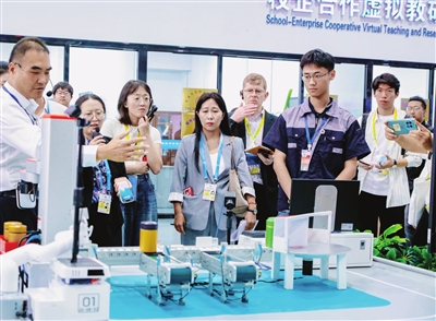 参访过程中,中外嘉宾和记者们不时驻足询问,并在现场热情参与互动。来自《金融时报》的记者约瑟夫·莱希一边仔细聆听讲解,一边举起手机拍摄。在对天津轻工职业技术学院院长李云梅进行采访时,约瑟夫·莱希不禁感慨道:“鲁班工坊在海外开展学历教育和技能培训,为世界技能人才培养作出了贡献。”