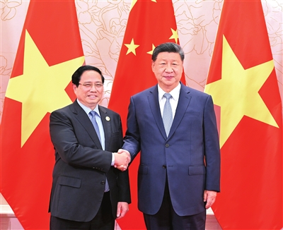 习近平指出,我今年4月对越南进行国事访问,双方就新形势下推进中越命运共同体建设达成重要共识。两国各部门各地方要加紧落实,推动中越全面战略合作取得更多实质性成果。面对加速演进的百年变局和变乱交织的国际形势,中越要坚定道路自信和制度自信,加强团结协作,推动中越命运共同体航船始终沿着正确方向稳步前行。