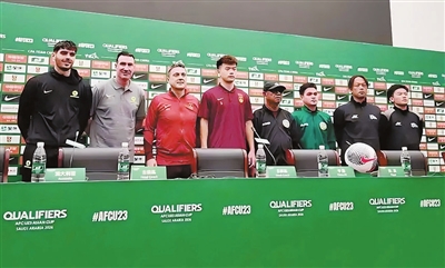 中国队球员及教练团队在新闻发布会上。 新华社发