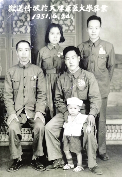 曾于抗战期间保护重伤员的李竹波(二排右),1951年于军医大学毕业后,与李月波(二排左)、靳纪(后排左)、李清波(后排右)合影留念。