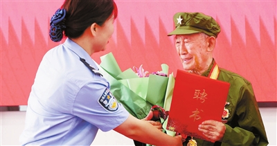 活动中,鞠宝斋在民警的搀扶下缓缓步入会场,他虽年至期颐,却仍精神矍铄、目光坚定,胸前佩戴的“中国人民抗日战争胜利80周年”纪念章熠熠生辉。鞠宝斋讲述着自己21岁入伍、22岁入党以来的峥嵘岁月,那句“如果党需要我上战场,我还能坚决上战场,还能为党尽最后的努力”,仿佛穿越80载光阴直抵人心,让在场民警为之动容。鞠宝斋的军旅生涯和赤胆忠心成为民警们最鲜活的理想信念教材。