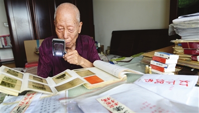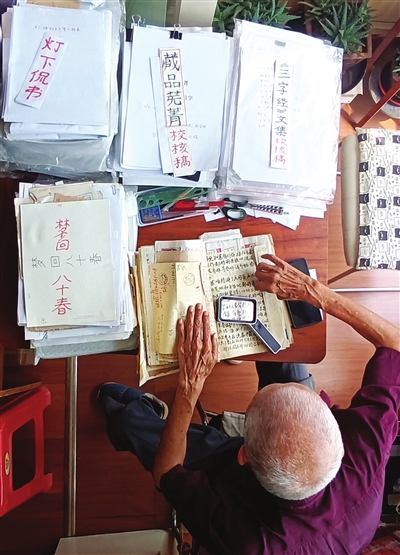 韩宝林不仅收藏书,还喜欢写书,一有时间便拿出书稿进行核校。