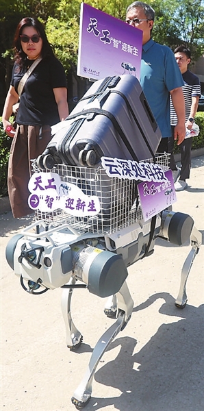 图为天津工业大学校友企业带着机器狗帮新生搬运行李。 记者 姜宝成 摄