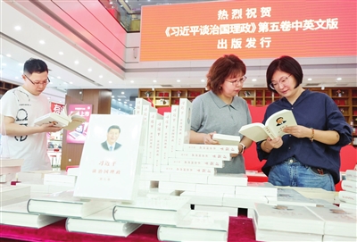 自《习近平谈治国理政》第五卷发行工作启动以来,我市充分发挥新华书店主题时政读物宣传发行主阵地、主渠道、主力军作用,通过线上发布消息、连锁配送中心及各区新华书店征订服务等方式,持续做好介绍、对接、推荐以及发行服务保障工作。记者 吴迪 摄