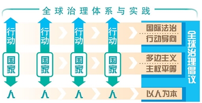 在从国家向国际社会延伸的维度上,国家不仅是在观念和政策层面上参与全球治理,最重要的是在行动层面上。全球治理倡议提出注重行动导向,强调通过具体的、切实有效的行动解决全球性问题,提升全球治理的有效性。而行动是受国际法治约束的行动,是正义的、道德的、符合国际规范的行动,也是尊重主权平等、基于多边主义框架、以人为本的行动。