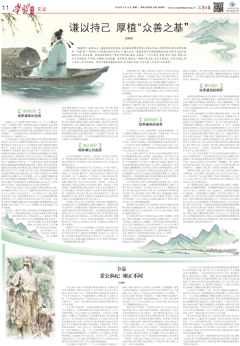“谦谦君子,温润如玉”,描述的是品德高尚、温和谦逊的君子形象,是古往今来人们所仰慕与神往的修养境界。何谓“谦”?程颐说:“以崇高之德而处卑之下,谦之义也。”意思是说尽管拥有崇高的品德,仍将自己置于较低的位置,这就是谦。陆九渊的解释是:“有而不居为谦;谦者,不盈也。”一个人有才、有能、有位、有功、有德,但并不自居其功,不自满、不骄傲,这就是谦。简单地说,谦就是一种虚心的态度,是不自高自大、不自以为是,肯于向他人学习的品德。儒家非常重视谦德的培养,认为谦不仅是“众善之基”,而且是“人之至德”。