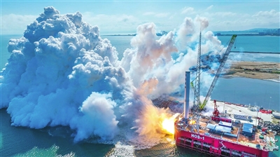 图为9月15日,天龙三号液体运载火箭在山东海阳东方航天港海上平台进行一级动力系统试车(无人机照片)。 新华社发