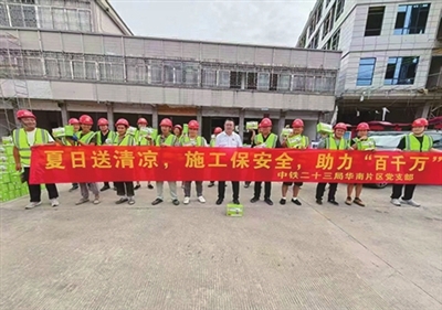 9月11日,虽已入秋,但肇庆地区依旧暑气未消。中铁二十三局华南区域项目党支部心系一线工人,积极组织开展了肇庆“百千万”项目送清凉活动,为在高温下坚守岗位的工人们送去关怀与清凉。“夏日送清凉,施工保安全,助力‘百千万’”,此次活动不仅为工人们驱散了夏日的炎热,更激发了大家的工作热情。工人们纷纷表示,将以更加饱满的精神状态投入到工作中,确保项目顺利推进,为肇庆“百千万”工程建设贡献自己的力量。 通讯员 黄马莉