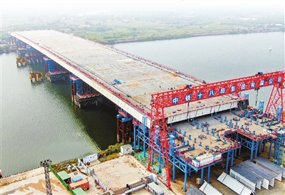 “顶推作业需要保证横向力的均匀性,为了保证作业平台稳定,我们搭建了钢管桩桩长约50米的顶推临时墩,单桩的承载力就达到了450吨,还创新应用了多种智能化方法。”陶友海说,“比如,施工前,项目团队联合高等院校利用计算机软件进行拼装模拟,反复调整优化施工方案,并在现场布置了高精度监控系统;再比如,我们在主梁架设过程中,创新采用了‘大吨位步履式千斤顶单向多点同步竖曲线顶推’施工技术,每个千斤顶的受力情况还可通过智控平台进行监测,以便及时对施工进行调整,确保钢箱梁精确按照预定路线顶推,精度误差控制在10毫米以内。”