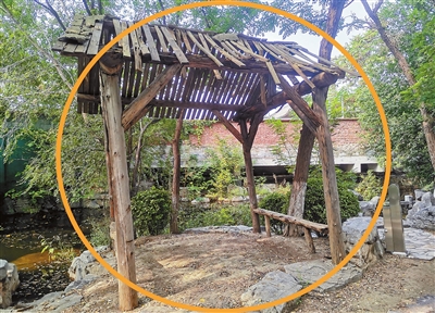 建筑群内,多处墙角堆放废弃垃圾袋,地面散落砖块等建筑垃圾,施工挡板被随意弃置于路边。一个石桌下堆积着七八个未清理的快餐盒。更严重的是,一座木结构亭子出现明显倾斜,顶部木条严重破损,存在倒塌风险。