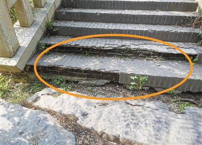 近日,记者在北运河畔西沽公园南侧的黄叶村看到,其木质门楼顶部的木条大量缺失,整体风貌显得破旧。此外,一座人造拱桥的栏杆扶手出现十余处损坏,锈蚀的钢筋裸露在外,与周边景观极不协调。另一座桥的桥面砖块破损十多处。