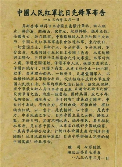 《中国人民红军抗日先锋军布告》。