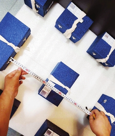 技术人员测量文物包装之间的距离,确保运输途中不互相碰撞。