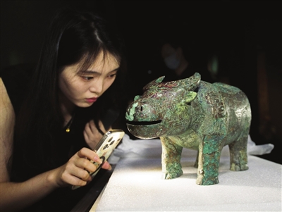 亚长牛尊被工作人员小心翼翼摆进天津博物馆展柜。