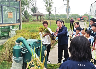 随后,4个学段的学生们来到宝坻小站稻科技小院的试验田,一起参与水稻收割、脱粒、稻米加工等实践活动。