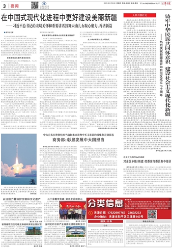 凝心聚力谋发展,同心协力创未来。让我们更加紧密地团结在以习近平同志为核心的党中央周围,全面贯彻习近平新时代中国特色社会主义思想,坚定信心、砥砺前进、久久为功,奋力建设团结和谐、繁荣富裕、文明进步、安居乐业、生态良好的美丽新疆。我们坚信,新疆的明天必将更加兴旺发达,新疆各族人民的生活必将更加幸福美满!