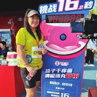 赛事间隙,达仁堂设计的文化互动环节妙趣横生。“清咽16.2秒大挑战”模拟咽喉不适的快速缓解场景,“一槌定音”游戏则让参与者在趣味中学习健康知识。在定制数字完赛留念墙前,选手们争相合影,“原来中医药可以这么潮!”,一名年轻跑者感叹道。