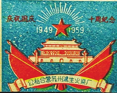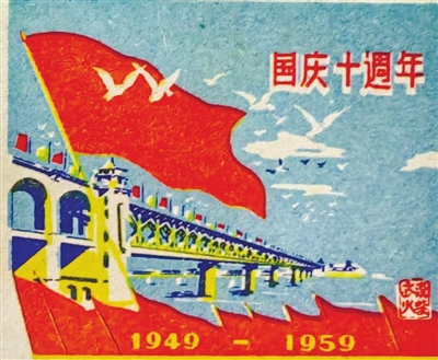 1959年,我国的“套花”刚问世不久,吉林、广东等近10家火柴厂就推出了“国庆10周年”纪念“套花”火花。其中,武汉火柴厂出品的“国庆10周年”火花,全套2枚,分别以天安门放飞的彩色气球和武汉长江大桥飘扬的红旗为图(图1);苏州鸿生火柴厂出品的“国庆10周年”火花共11枚,除两枚分别为“天安门、红旗”(图2)“舞龙、灯笼”图案外,其余9枚在宣传新中国10年建设成就的同时,还留下了难得的岁月痕迹,增加了历史性和文物价值。