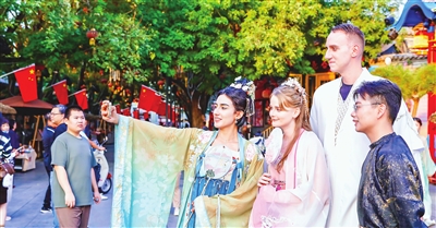 国庆假期,杨柳青古镇重点以近代北方商帮远征西域的“赶大营”历史为脉络,推出了以“源起柳口”“西出阳关”“百艺进疆”等为主题的展演、互动和体验活动,让游客穿越到那个万商云集的年代。