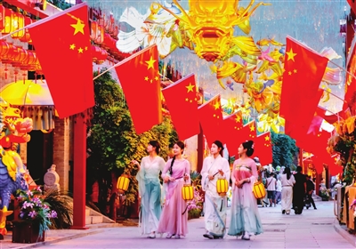 国庆中秋双节至,经过持续焕新改造后的杨柳青古镇灯火璀璨,节日氛围浓郁。