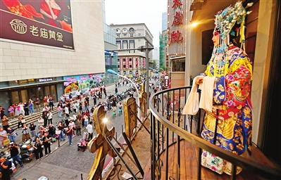 随着悦耳的丝竹声响起,身着华裳的“杨贵妃”亮相中国大戏院二楼阳台,韵味十足地唱起了京剧《贵妃醉酒》,途经此处的游人纷纷驻足欣赏、鼓掌喝彩。假期里,每天傍晚时分,在中国大戏院二楼阳台上演的京剧《贵妃醉酒》《霸王别姬》都会与都市霓虹共舞,构成一幅绝美的画卷。“梅兰芳先生就曾在这演出过,快进去看看。”来自山西的游客李萌边拿手机拍摄,边招呼朋友进戏院,她笑着说,“没想到刚出地铁站就遇到这么美的表演,天津果然是处处有戏。”