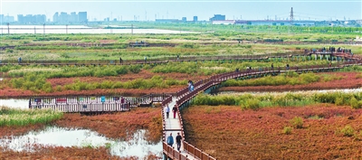 近日,滨海新区大港油田碱蓬草观景长廊迎来观赏期。50余万亩碱蓬草在秋风中由翠绿转深红,宛若“红海滩”,绘就灿若红霞的壮丽图景,不仅吸引各地游客纷至沓来,更成为滨海新区市民的热门“打卡”地。