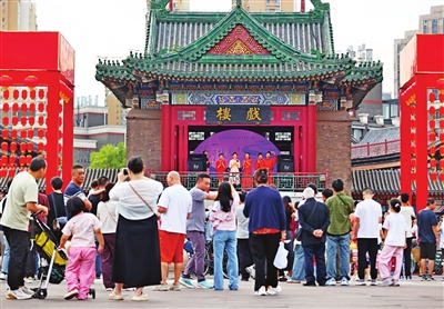 国庆假期期间,我市以“戏聚天津·无处不沉浸”为主题,成功打造了一场全城联动、全民共享的艺术盛宴。图为古文化街戏楼上演曲艺剧《海河故影》沉浸版。