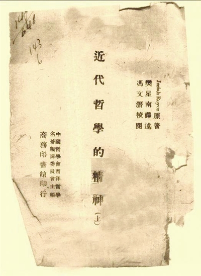 ①《近代哲学的精神》(罗伊斯原著,樊南星译述,冯文潜校阅)商务印书馆1943年版封面。