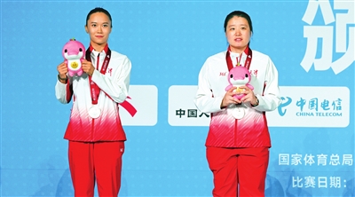 昨天,十五运会蹦床女子网上个人决赛,天津选手朱雪莹(左)夺得银牌。 记者 孙震 摄