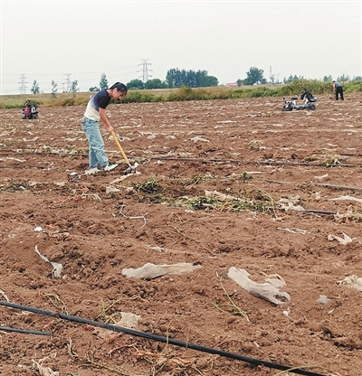 10月1日下午,记者在武清区陈咀镇庞庄村永定河大堤南看到,田地周围停放着几十辆私家车,一片刚用农用机械收完的红薯地里聚集了几十位“拾红薯”的市民。村民庞大爷告诉记者:“这块地昨天傍晚刚收完,专业团队和农业机械一走,人就进来了,还有人带着顶灯连夜挖。到现在,这地已被翻了三四遍。”一天之内,这片面积3亩的田地吸引了200多人参与“寻薯之旅”。