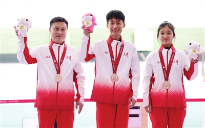 本报广州电(记者 谢晨 摄影 刘欣)第十五届全国运动会射击(步手枪)项目昨天在广东射击馆落幕,在50米步枪三姿混合团体铜牌赛中,天津一队的赵文宇/张力元组合以32:24战胜山东一队的李晓雪/张常鸿组合,为天津代表团再添一枚铜牌,浙江一队和浙江二队分获冠亚军。