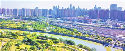 红桥区子牙河滨河公园,树木河水相映,尽显生态之美。