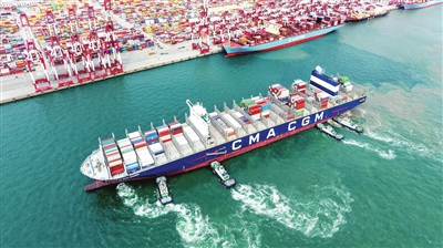 10月20日,一艘货轮在拖船辅助下停靠山东港口青岛港集装箱码头。 新华社发