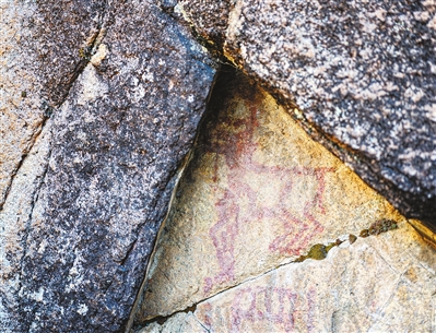 10月21日,陈雪松在实地调查海子山老林沟拉托扎岩画。该处岩画位于海子山南侧老林沟内,岩画由小型鹿图案、三角形以及X型符号组成。