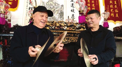 津门法鼓(刘园祥音法鼓)第四代非遗代表性传承人田文起(左)与第五代非遗代表性传承人刘玉新排练中。