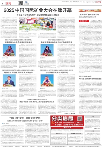 本报讯(记者 陈璠)昨日,由中华人民共和国自然资源部、天津市人民政府指导,中国矿业联合会主办的2025(第二十七届)中国国际矿业大会在津开幕。本届大会以“互融互通,共建共享”为主题,彰显矿业国际合作的重要性,倡导相互了解、融通发展、互利共赢,共同促进全球矿业繁荣。