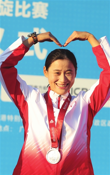 天津选手陈琳获得银牌后庆祝。
