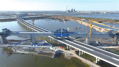 近日,中国铁建大桥局承建的津潍高铁天津段又有新进展,跨津石高速大跨度连续梁施工正在稳步推进,长128米,重约8500吨,位于高约26米的墩身上施工,相当于9层楼的高度,预计12月中旬合龙。 李天玉 摄