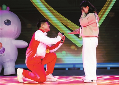 天津举重队的刘焕华昨天双喜临门,顺利拿到全运会金牌并打破全国纪录的同时,他还在现场向女友——天津举重队的韦露反成功求婚。现场所有的工作人员和志愿者都是他们的见证者。
