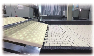 首先走进全自动生产车间的和面工序,只见寥寥几名工人在设备前值守。马铃薯面团在流水线上经历多次滚压,从厚厚的面饼,逐渐变成仅有0.5毫米的薄片,再经模具切割,成为整齐的小方坯,送入烤炉。