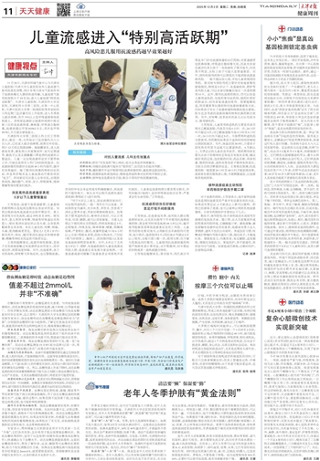天津医科大学第二医院儿科主任王雪艳表示,最近一周,儿科每日门急诊量约为六七百人次,已经进入就诊高峰期,按照往年经验,预计12月初达到最高峰。她提醒家长,进入流感高发季,避免到人员密集场所、室内定期通风、勤洗手以及正确佩戴口罩是预防流感的主要途径。儿童一旦出现流感样症状不要带病上学,可就近选择有儿科门诊的医院鉴诊。抗流感病毒药物最好在起病48小时内服用,越早吃效果越好。除了服用抗病毒药物和对症药品,休息和多喝水是儿童流感治疗最有效的“处方”。其间密切关注患儿全身状况,出现持续高热、胸闷憋气、皮疹、尿少、呼吸困难、精神萎靡等情况要及时就诊。