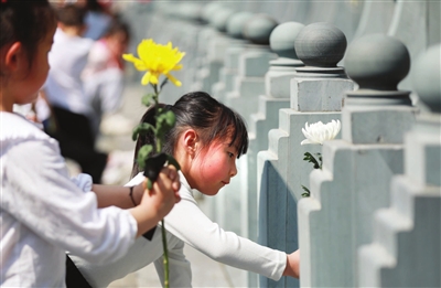 4月4日,小朋友在贵州省黔东南苗族侗族自治州剑河县烈士陵园向烈士墓敬献鲜花。